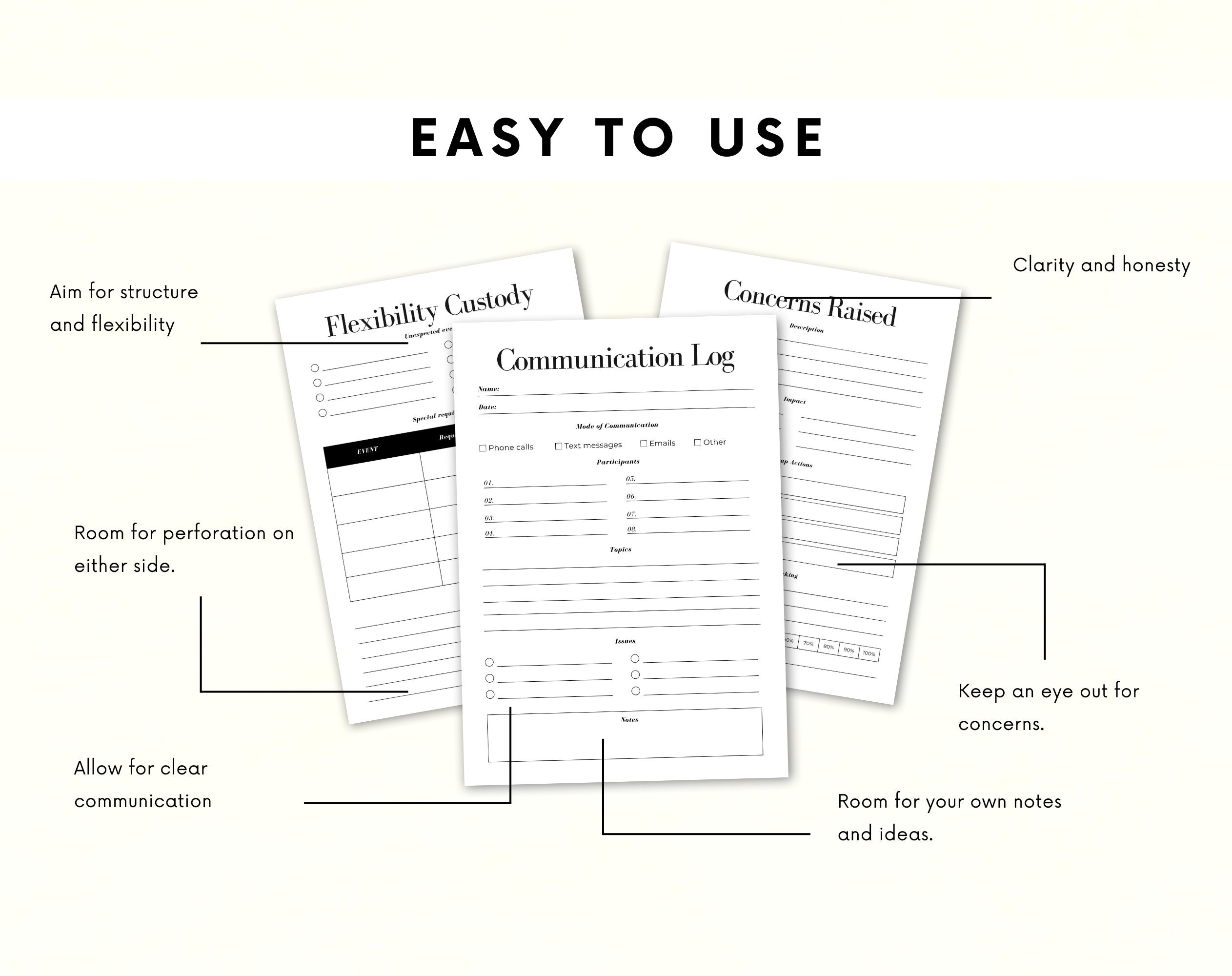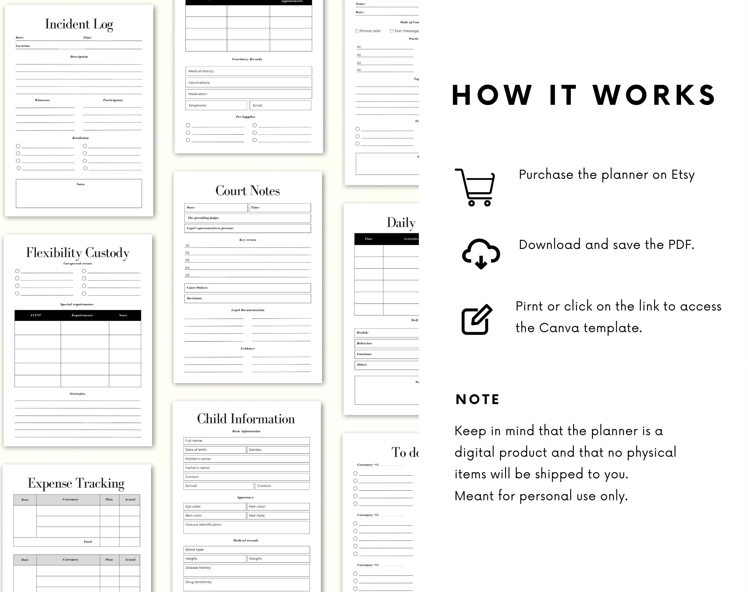 ♦ The Custody Planner is meant for PERSONAL USE only. The planner DOES NOT come with a commercial license to copy, alter, share, re-sell or distribute it in any way.