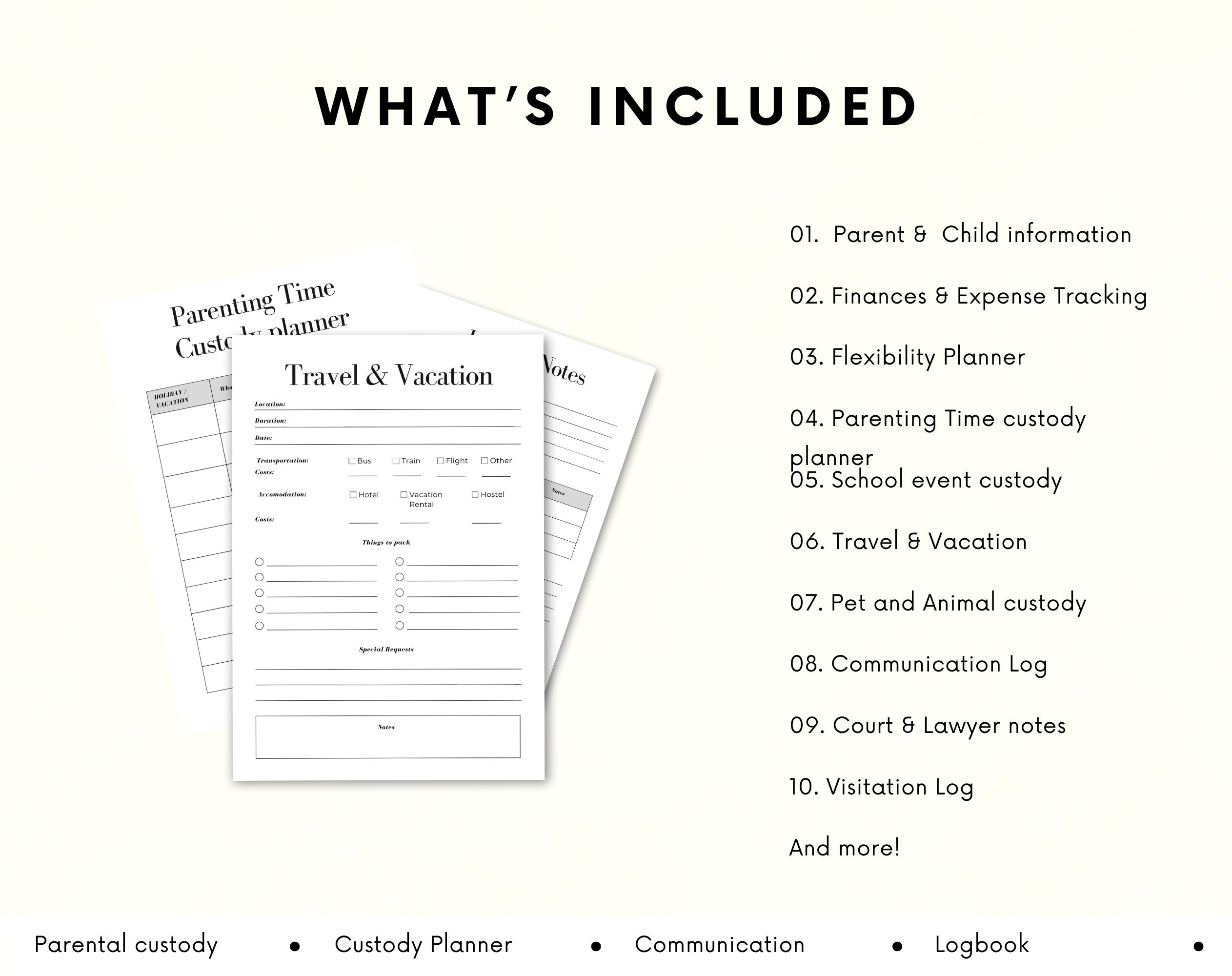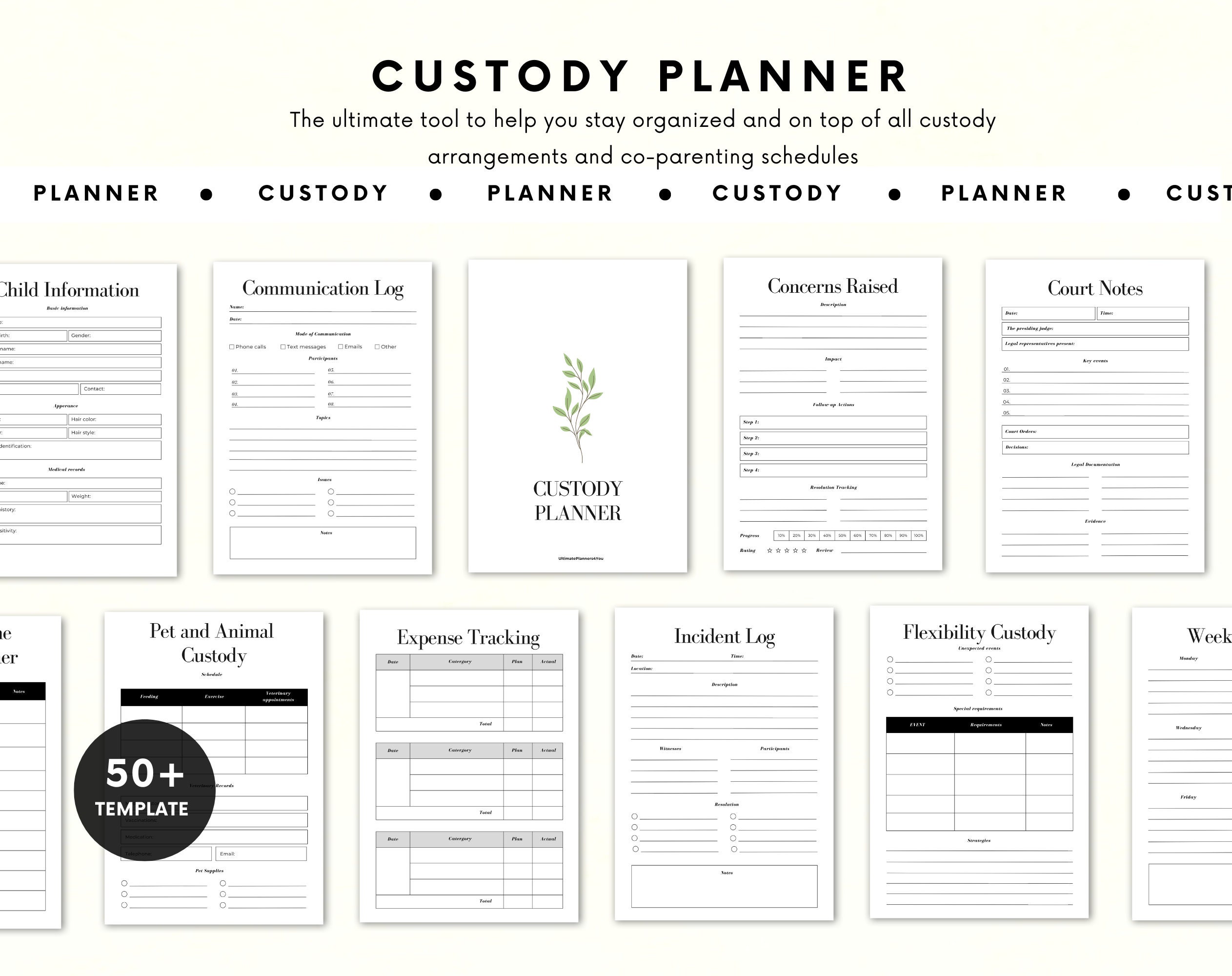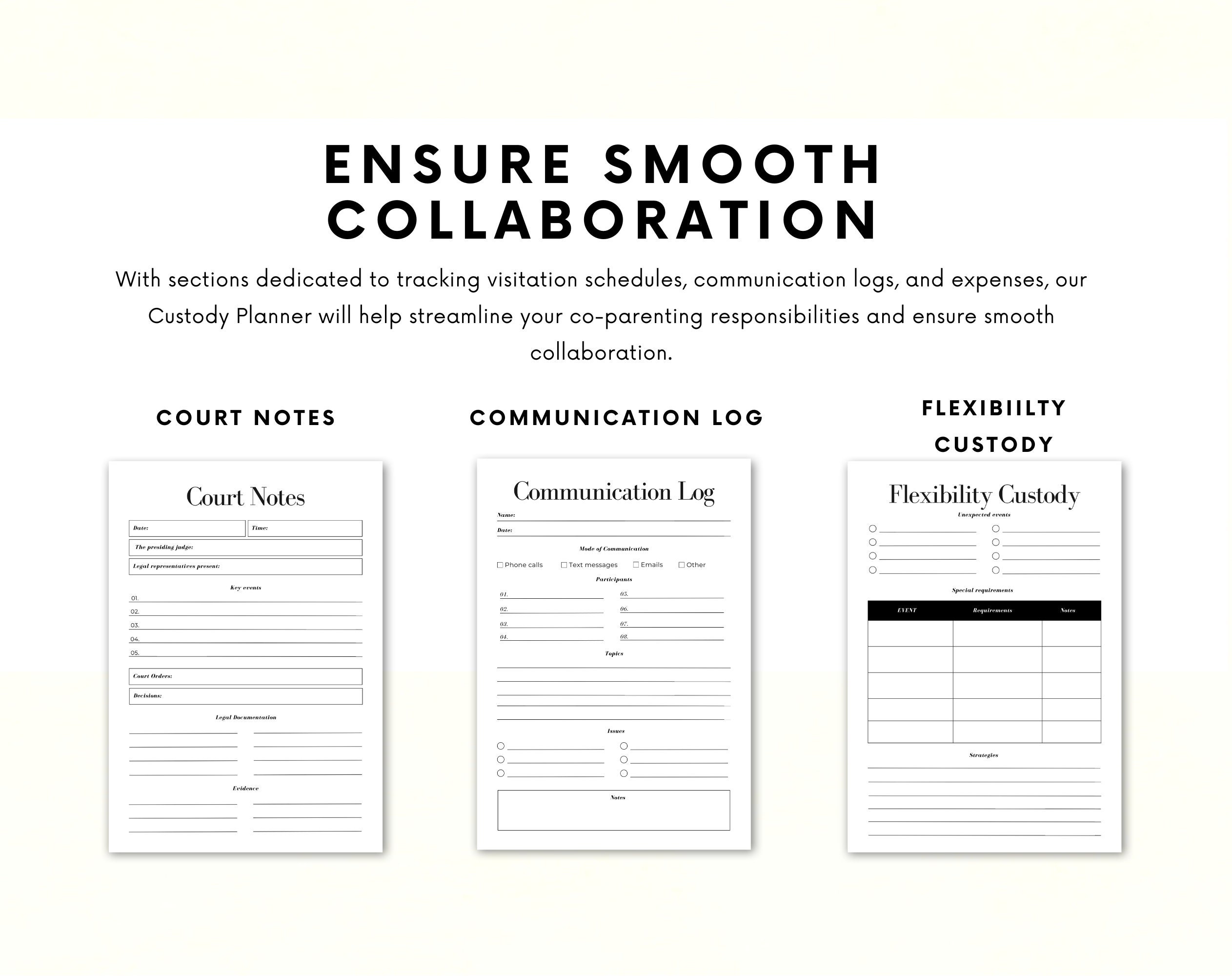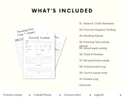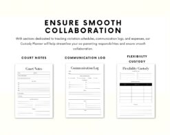 With sections dedicated to tracking visitation schedules, communication logs, and expenses, our Custody Planner will help streamline your co-parenting responsibilities and ensure smooth collaboration.