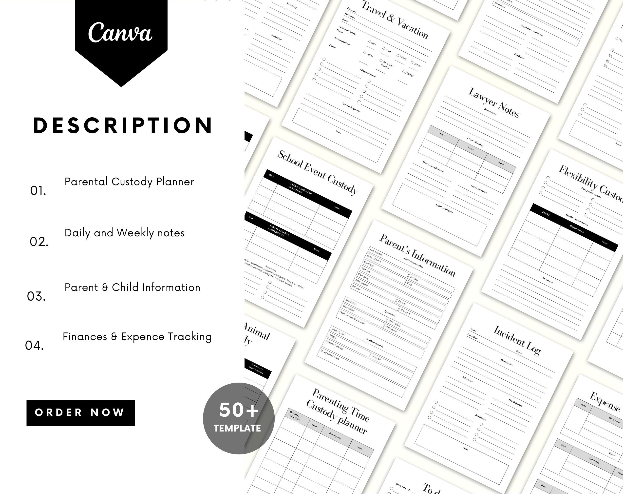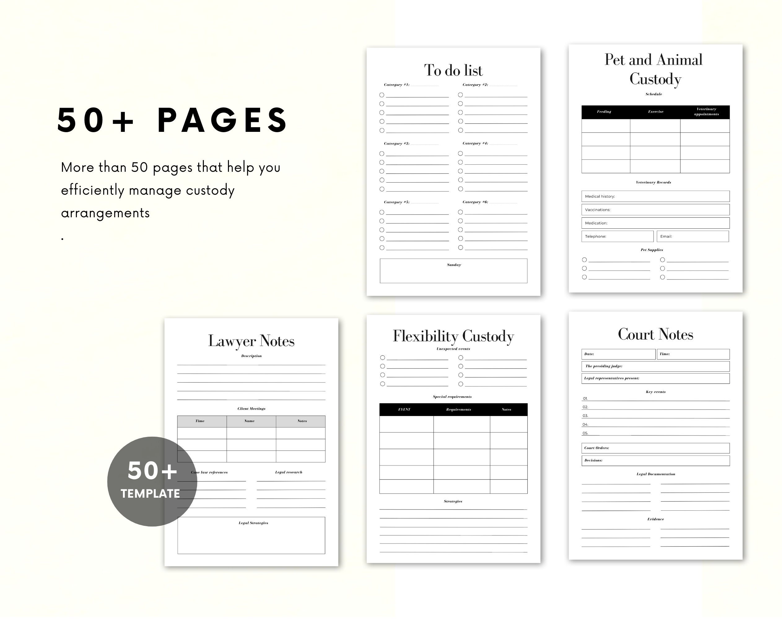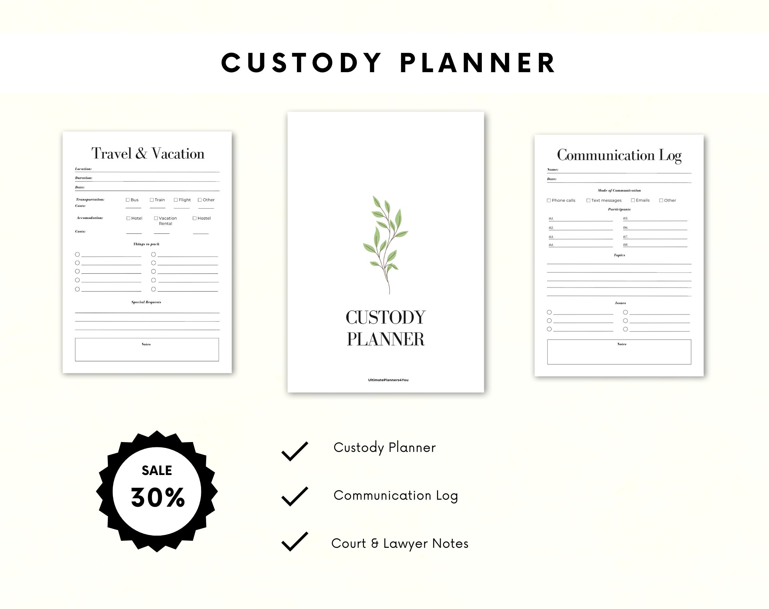 With sections dedicated to tracking visitation schedules, communication logs, and expenses, our Custody Planner will help streamline your co-parenting responsibilities and ensure smooth collaboration.