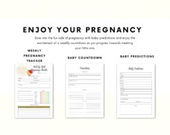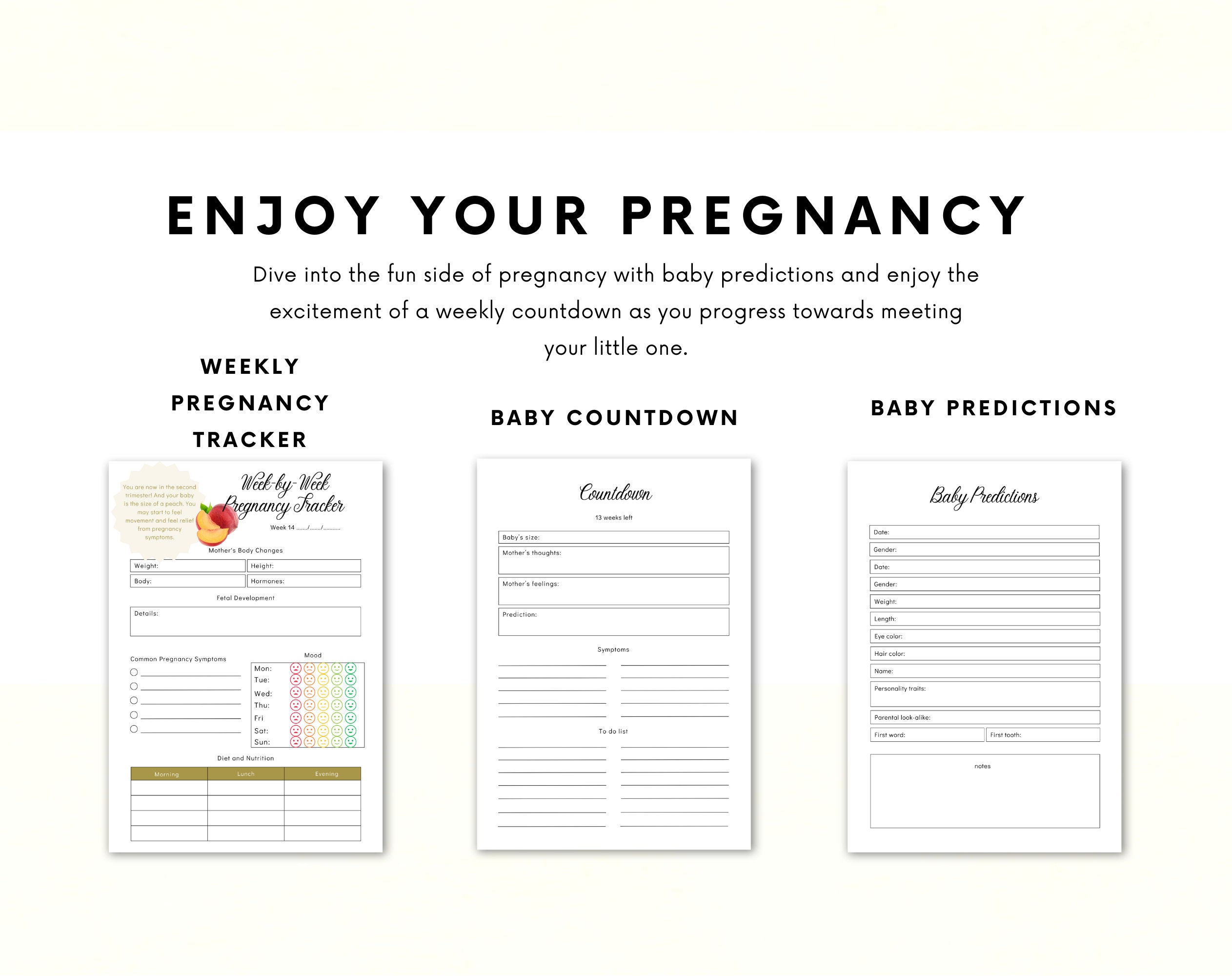Introducing the ultimate Pregnancy Planner and Pregnancy Journal designed to guide you through every step of your pregnancy journey and to prepare for your little miracle! This comprehensive pregnancy book includes a detailed week by week pregnancy tracker to keep you informed about your baby’s growth and development. Stay up to date with fetal development milestones, track your baby’s size each week and prepare for the big day with a hospital bag checklist. Dive into the fun side of pregnancy with baby predictions and enjoy the excitement of a weekly countdown as you progress towards meeting your little one.